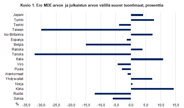 Maat, joissa on suurimmat euromääräiset positiiviset erot MDE-aineiston ja Intrastat-aineiston välillä ovat ulkokaupassa Kiina, Yhdysvallat ja Vietnam. EU-maista Italian, Romanian ja Ranskan osuudet kasvavat. Ruotsin, Tanskan ja Saksan osuudet laskevat eniten EU-kaupassa, mutta usean muunkin EU-maan osuus tavaran alkuperämaana laskee.
