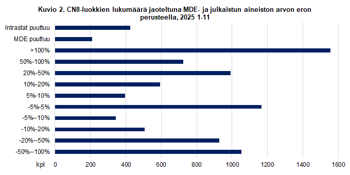 Analyysissä verrattiin MDE-tietoja julkaistuihin Intrastat-tietoihin. Yhteensä eroavia CN-luokkia 8-numerotasolla on noin 8 900 kappaletta tutkitussa 2025 1-11 aineistossa. Kaikkiaan CN8-luokkia tarkimmalla tasolla oli 9778 kappaletta vuonna 2025. Kaikissa luokissa ei välttämättä ollut tuontia Suomeen lainkaan.