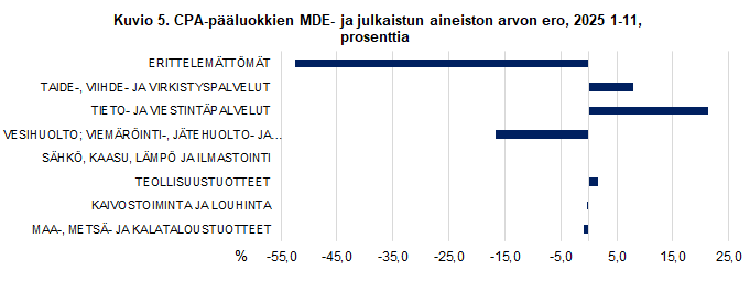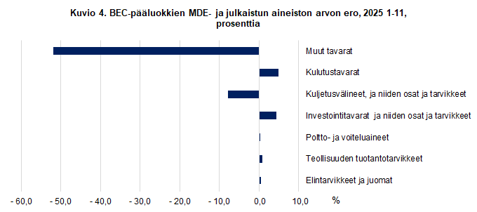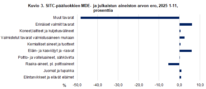 Tilaston kuukausittaiset erot Intrastat-järjestelmällä kerättyjen tietojen ja MDE-tietojen välillä ovat kokonaisarvotasolla pieniä. Kumulatiiviset arvot pienentävät eroja entisestään, joten vuositasoa lähestyttäessä (2025 1-11) ero tilastoarvossa oli vain -0,03 prosenttia tai noin 19 miljoonaa. MDE-tietojen arvo oli suurempi kuin Intrastat-järjestelmällä kerätyn aineiston arvo.
