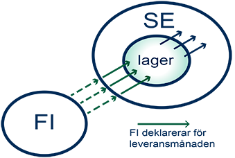 Exempel: Ett finskt företag säljer varor till ett svenskt företag, varorna levereras från Finland till ett lager beläget i det svenska företagets lokaler. SE tar varorna i bruk efterhand som varorna behövs för affärsverksamheten. FI fakturerar SE månatligen enligt mängden som tas från lagret. På lagret finns ingen personal under FI:s bestämmanderätt och varorna säljs endast till företaget SE. Det finska företaget gör Intrastat-deklaration för de utförda varorna enligt varuleveransen. Transaktionstyp är 32.